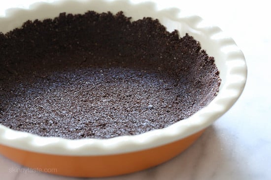 Making a low-fat graham cracker crust is SO easy to do, using just 3 ingredients (plus water), you’ll never buy a pre-made one again. You can use regular graham crackers, gluten-free, or even chocolate like I did here. Once made, you can fill it with anything your heart desires.