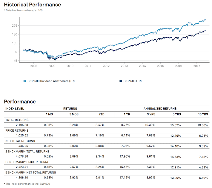 To put this into perspective, $1.00 invested in the Dividend Aristocrats index 10 years ago would be worth $2.59 now, versus $2.00 for the S&P 500 (both numbers include dividends). Moreover, your portfolio wouldn’t have had as severe price swings, because the Dividend Aristocrats index has lower volatility than the S&P 500.