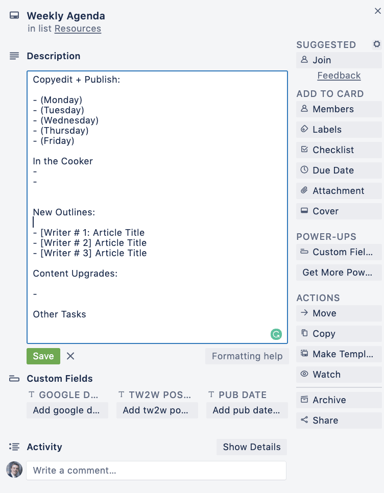 - Other Tasks. This is where we review other content-related tasks that need to be taken care of over the week. A good example here is that when an affiliate changes a certain feature of their offerings, we go back through old posts to update our content.