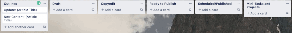 We then have a “stack” (which is basically a column) for each of these categories. Each article gets an individual “card,” and that card is moved from left to right as it progresses through the different stages of development (from Outline to Published).