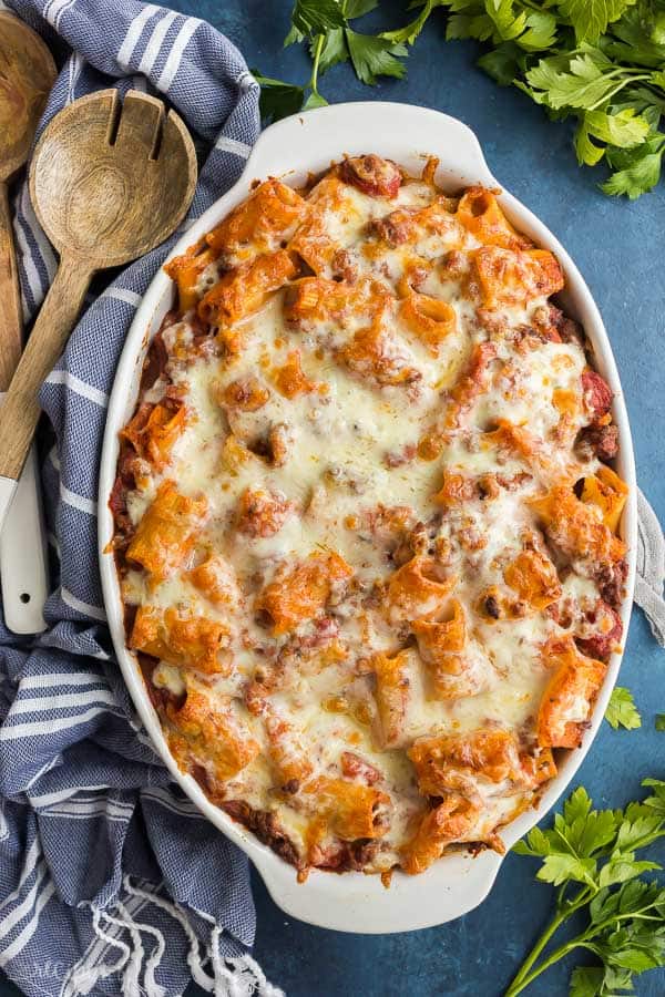 • Rigatoni Pasta Bake – I love pasta, and this pasta dish is full of garlic, cheese, and Italian seasonings. You can also substitute Italian sausage for ground beef.