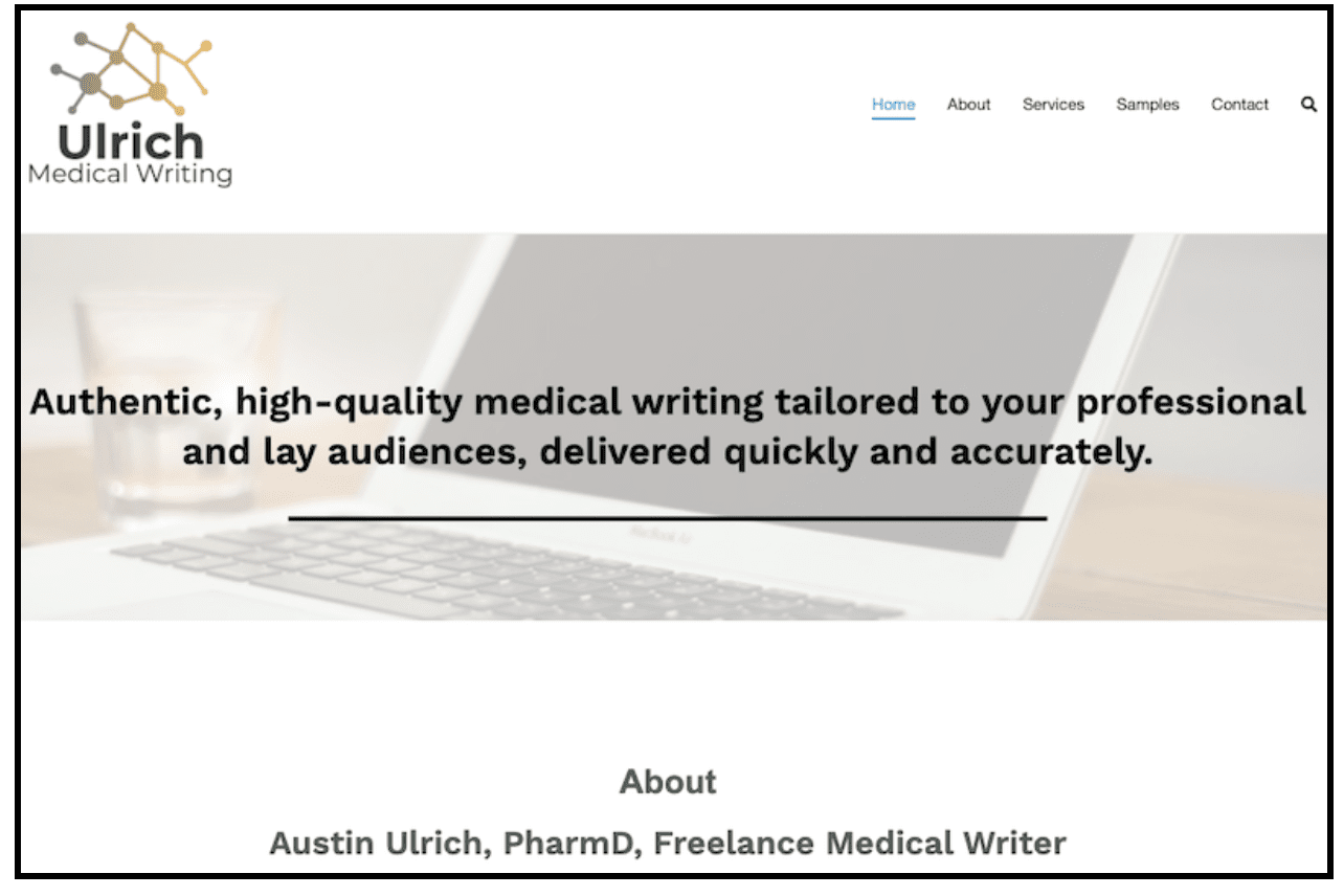 After learning a lot about the profession, I set up a simple website (screenshot below) and launched my freelance medical writing business, Ulrich Medical Writing, LLC in July 2019.