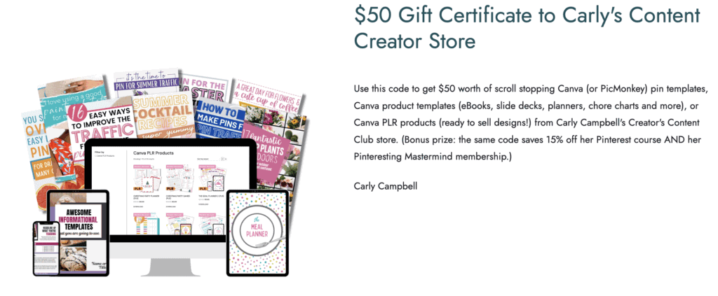 • $50 Gift Certificate to Carly’s Content Creator Store