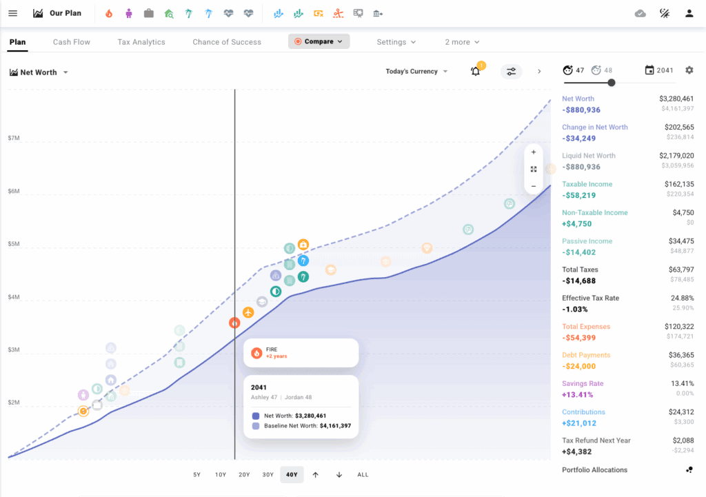 It’s powerful enough for people who have complex situations, like multiple income streams, rental properties, seasonal living, or early retirement plans. I especially appreciate that you can run realistic Monte Carlo simulations, track your net worth over time, and see exactly how your cash flow changes with different life choices.