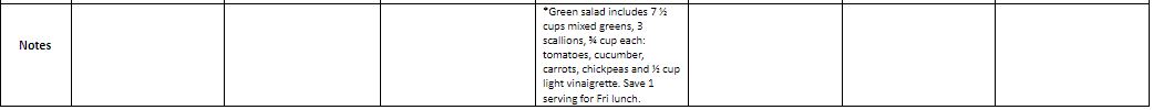 **Green salad includes 7 ½ cups mixed greens, 3 scallions, ¾ cup each: tomatoes, cucumber, carrots, chickpeas and ½ cup light vinaigrette. Save 1 serving for Fri lunch.