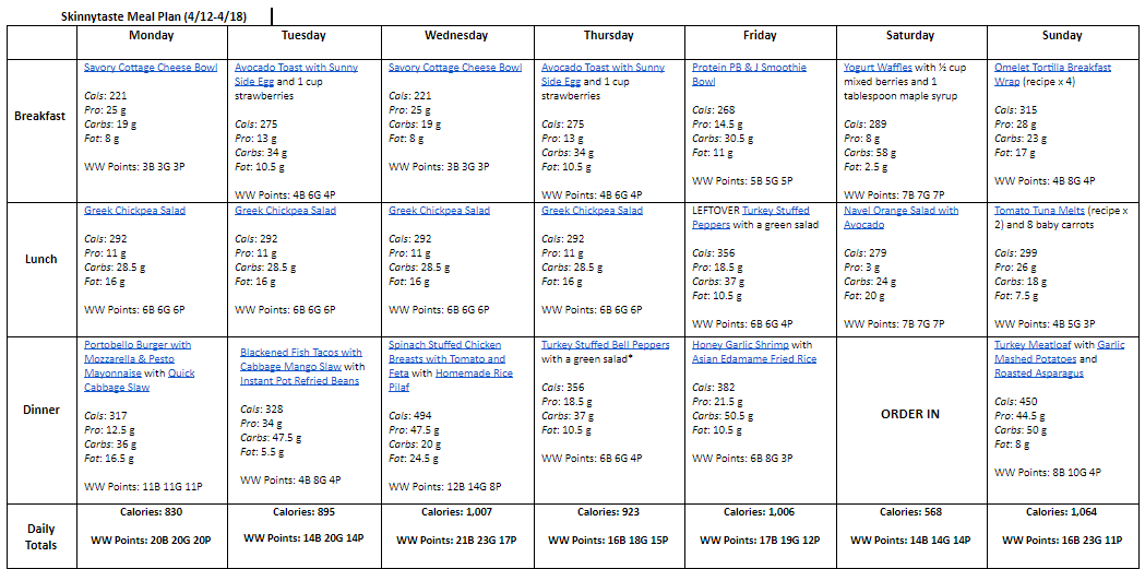 Breakfast and lunch Monday-Friday, are designed to serve 1 while dinners and all meals on Saturday and Sunday are designed to serve a family of 4. Some recipes make enough leftovers for two nights or lunch the next day. While we truly believe there is no one size fits all meal plan, we did our best to come up with something that appeals to a wide range of individuals. Everything is Weight Watchers friendly, I included the updated WW Blue SP for your convenience, feel free to swap out any recipes you wish or just use this for inspiration!