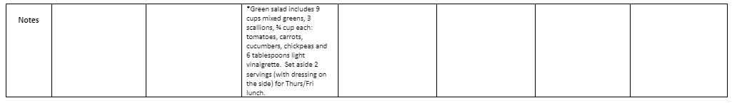 **Green salad includes 9 cups mixed greens, 3 scallions, ¾ cup each: tomatoes, carrots, cucumbers, chickpeas and 6 tablespoons light vinaigrette. Set aside 2 servings (with dressing on the side) for Thurs/Fri lunch.