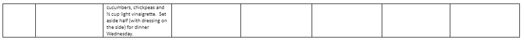 **Green salad includes 12 cups mixed greens, 4 scallions, 1 cup each: tomatoes, carrots, cucumbers, chickpeas and ½ cup light vinaigrette. Set aside half (with dressing on the side) for dinner Wednesday.