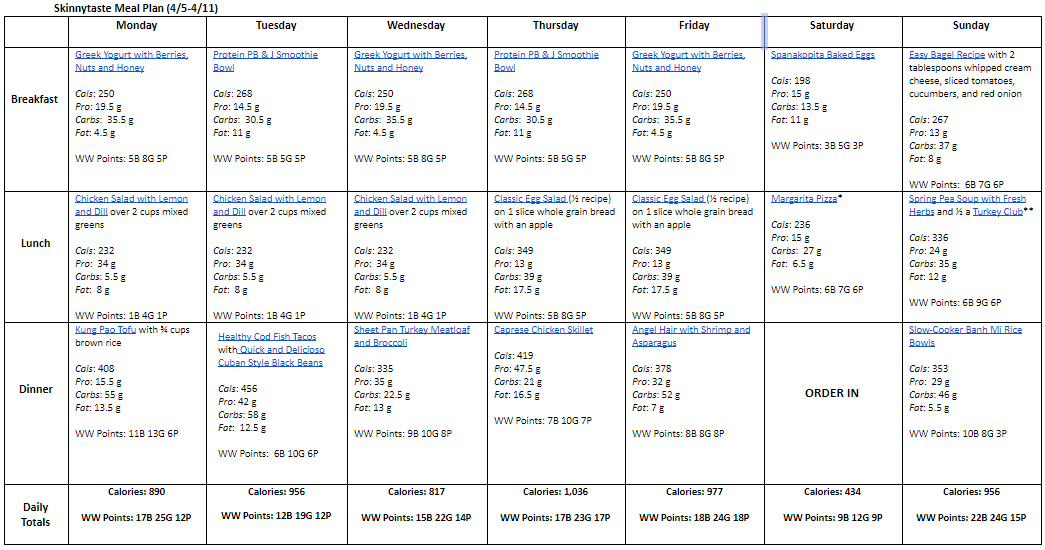 Breakfast and lunch Monday-Friday, are designed to serve 1 while dinners and all meals on Saturday and Sunday are designed to serve a family of 4. Some recipes make enough leftovers for two nights or lunch the next day. While we truly believe there is no one size fits all meal plan, we did our best to come up with something that appeals to a wide range of individuals. Everything is Weight Watchers friendly, I included the updated WW Blue SP for your convenience, feel free to swap out any recipes you wish or just use this for inspiration!