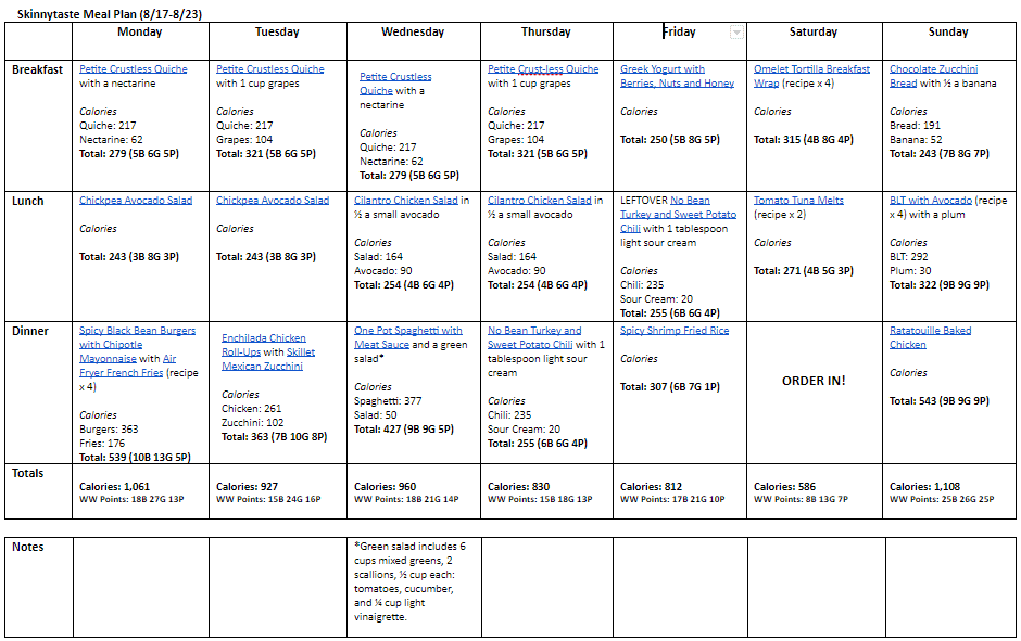 Breakfast and lunch Monday-Friday, are designed to serve 1 while dinners and all meals on Saturday and Sunday are designed to serve a family of 4. Some recipes make enough leftovers for two nights or lunch the next day. While we truly believe there is no one size fits all meal plan, we did our best to come up with something that appeals to a wide range of individuals. Everything is Weight Watchers friendly, I included the updated WW Blue SP for your convenience, feel free to swap out any recipes you wish or just use this for inspiration!
