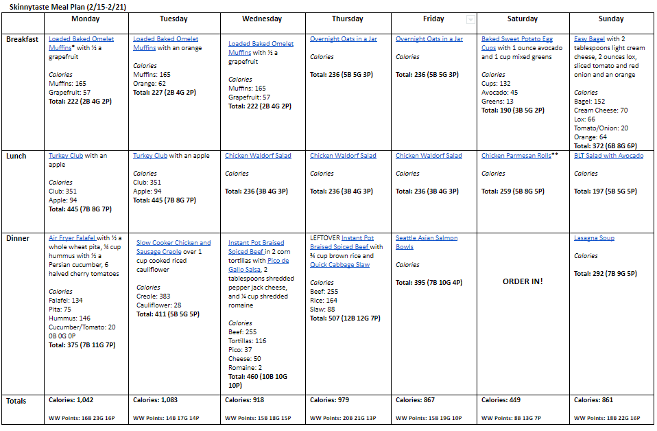 Breakfast and lunch Monday-Friday, are designed to serve 1 while dinners and all meals on Saturday and Sunday are designed to serve a family of 4. Some recipes make enough leftovers for two nights or lunch the next day. While we truly believe there is no one size fits all meal plan, we did our best to come up with something that appeals to a wide range of individuals. Everything is Weight Watchers friendly, I included the updated WW Blue SP for your convenience, feel free to swap out any recipes you wish or just use this for inspiration!