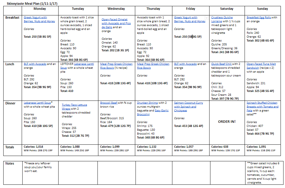 Breakfast and lunch Monday-Friday, are designed to serve 1 while dinners and all meals on Saturday and Sunday are designed to serve a family of 4. Some recipes make enough leftovers for two nights or lunch the next day. While we truly believe there is no one size fits all meal plan, we did our best to come up with something that appeals to a wide range of individuals. Everything is Weight Watchers friendly, I included the updated WW Blue SP for your convenience, feel free to swap out any recipes you wish or just use this for inspiration!