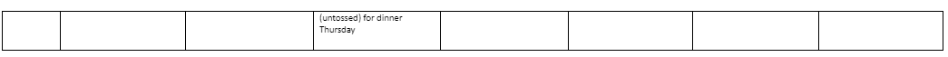 # Green salad includes 12 cups chopped Romaine, 4 scallions, 1 cup each: cucumbers, tomatoes, carrots, chickpeas and ½ cup light vinaigrette. Set aside ½ (un-tossed) for dinner Thursday.