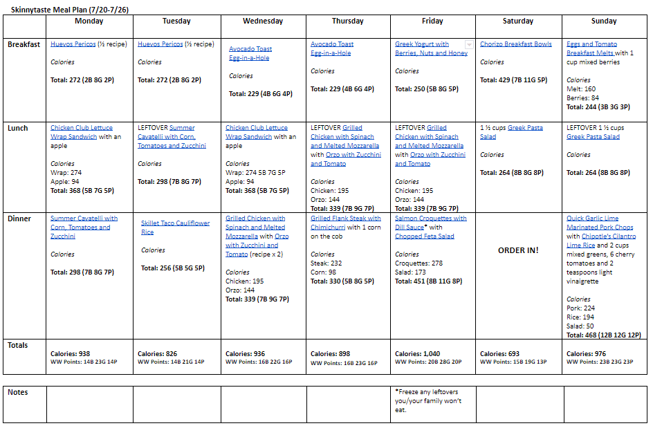 Breakfast and lunch Monday-Friday, are designed to serve 1 while dinners and all meals on Saturday and Sunday are designed to serve a family of 4. Some recipes make enough leftovers for two nights or lunch the next day. While we truly believe there is no one size fits all meal plan, we did our best to come up with something that appeals to a wide range of individuals. Everything is Weight Watchers friendly, I included the updated WW Blue SP for your convenience, feel free to swap out any recipes you wish or just use this for inspiration!