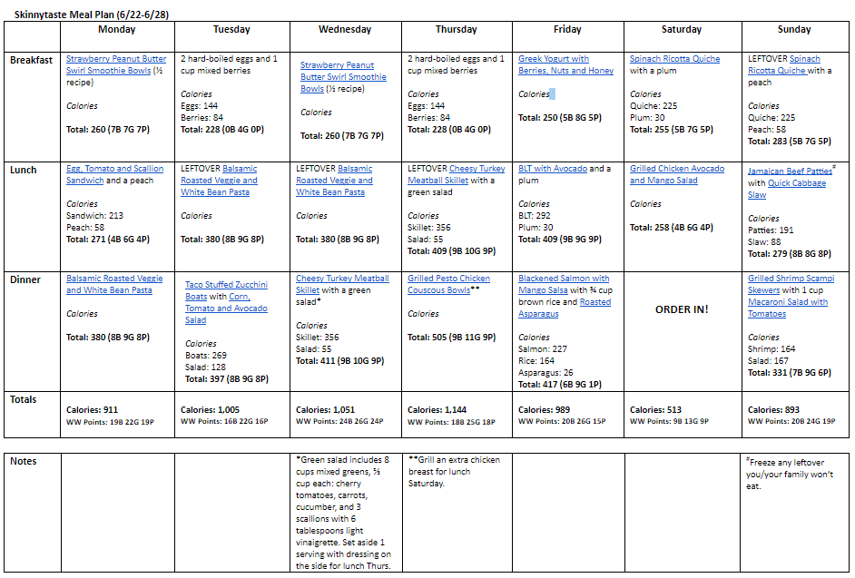 Breakfast and lunch Monday-Friday, are designed to serve 1 while dinners and all meals on Saturday and Sunday are designed to serve a family of 4. Some recipes make enough leftovers for two nights or lunch the next day. While we truly believe there is no one size fits all meal plan, we did our best to come up with something that appeals to a wide range of individuals. Everything is Weight Watchers friendly, I included the updated WW Blue SP for your convenience, feel free to swap out any recipes you wish or just use this for inspiration!