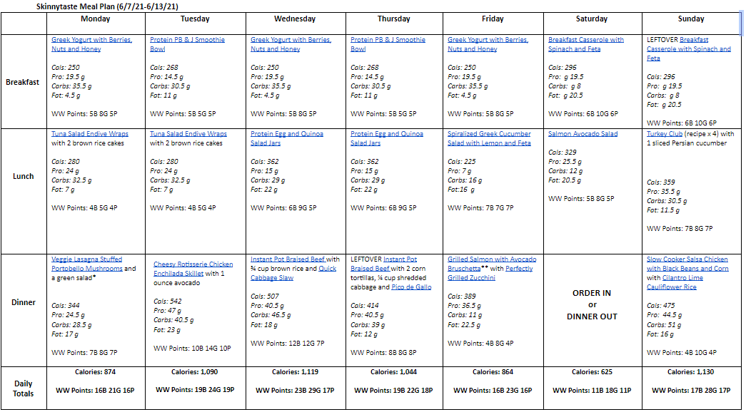 Breakfast and lunch Monday-Friday, are designed to serve 1 while dinners and all meals on Saturday and Sunday are designed to serve a family of 4. Some recipes make enough leftovers for two nights or lunch the next day. While we truly believe there is no one size fits all meal plan, we did our best to come up with something that appeals to a wide range of individuals. Everything is Weight Watchers friendly, I included the updated WW Blue SP for your convenience, feel free to swap out any recipes you wish or just use this for inspiration!