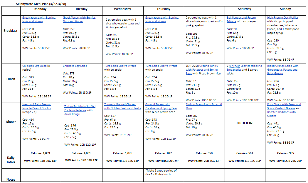 Breakfast and lunch Monday-Friday, are designed to serve 1 while dinners and all meals on Saturday and Sunday are designed to serve a family of 4. Some recipes make enough leftovers for two nights or lunch the next day. While we truly believe there is no one size fits all meal plan, we did our best to come up with something that appeals to a wide range of individuals. Everything is Weight Watchers friendly, I included the updated WW Blue SP for your convenience, feel free to swap out any recipes you wish or just use this for inspiration!