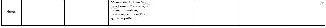 **Green salad includes 6 cups mixed greens, 2 scallions, ½ cup each: tomatoes, cucumber, carrots, chickpeas and ¼ cup light vinaigrette.