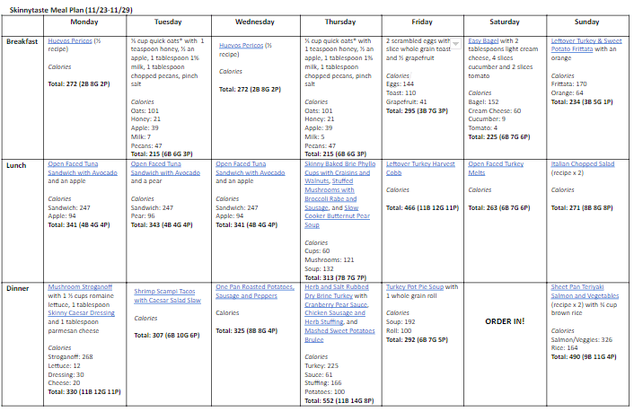 **You will need 1 ¼ pounds leftover cooked turkey if you want to make all the leftovers in the plan. Adjust raw turkey weight accordingly.
