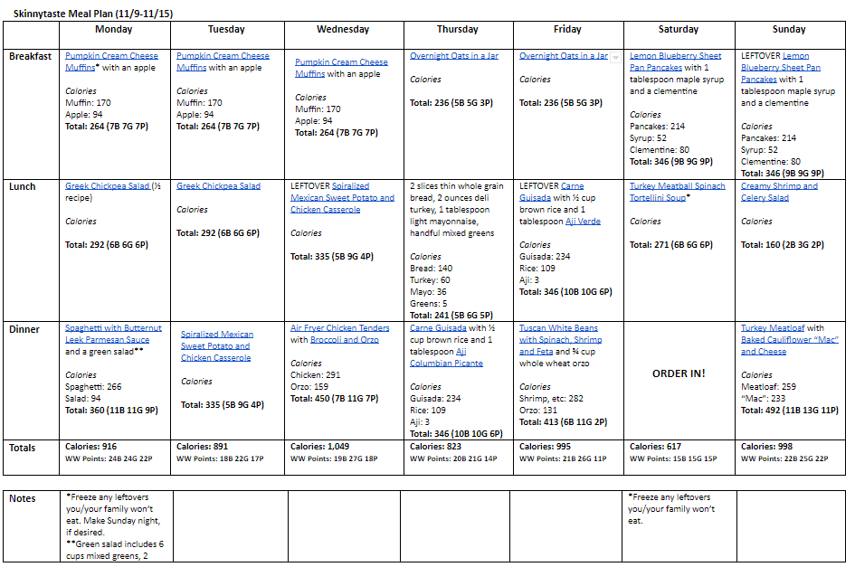 Breakfast and lunch Monday-Friday, are designed to serve 1 while dinners and all meals on Saturday and Sunday are designed to serve a family of 4. Some recipes make enough leftovers for two nights or lunch the next day. While we truly believe there is no one size fits all meal plan, we did our best to come up with something that appeals to a wide range of individuals. Everything is Weight Watchers friendly, I included the updated WW Blue SP for your convenience, feel free to swap out any recipes you wish or just use this for inspiration!