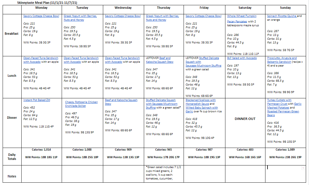Breakfast and lunch Monday-Friday, are designed to serve 1 while dinners and all meals on Saturday and Sunday are designed to serve a family of 4. Some recipes make enough leftovers for two nights or lunch the next day. While we truly believe there is no one size fits all meal plan, we did our best to come up with something that appeals to a wide range of individuals. Everything is Weight Watchers friendly, I included the updated WW Blue SP for your convenience, feel free to swap out any recipes you wish or just use this for inspiration!