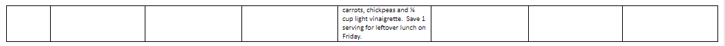 **Green salad includes 7 1/2 cups mixed greens, 2 scallions, ½ cup each: tomatoes, cucumber, carrots, chickpeas and ¼ cup light vinaigrette. Save 1 serving for leftover lunch on Friday.