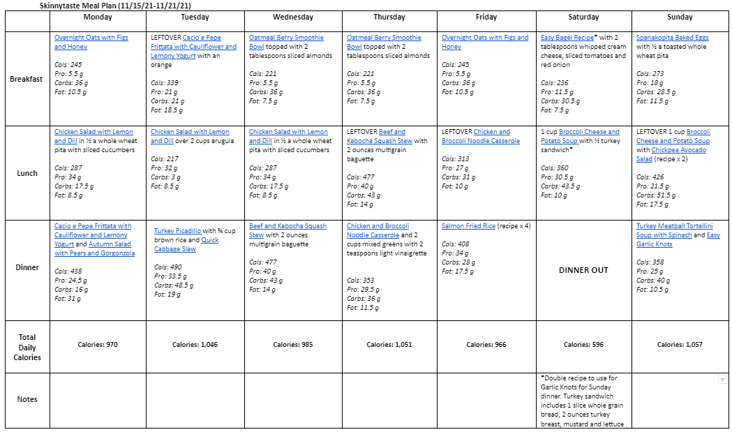 And last, but certainly not least, this meal plan is flexible and realistic. There’s plenty of wiggle room for cocktails, healthy snacks, dessert and dinner out. And if necessary, you can move some things around to make it work with your schedule. Please let me know if you’re using these plans, this will help me decide if I should continue sharing them!
