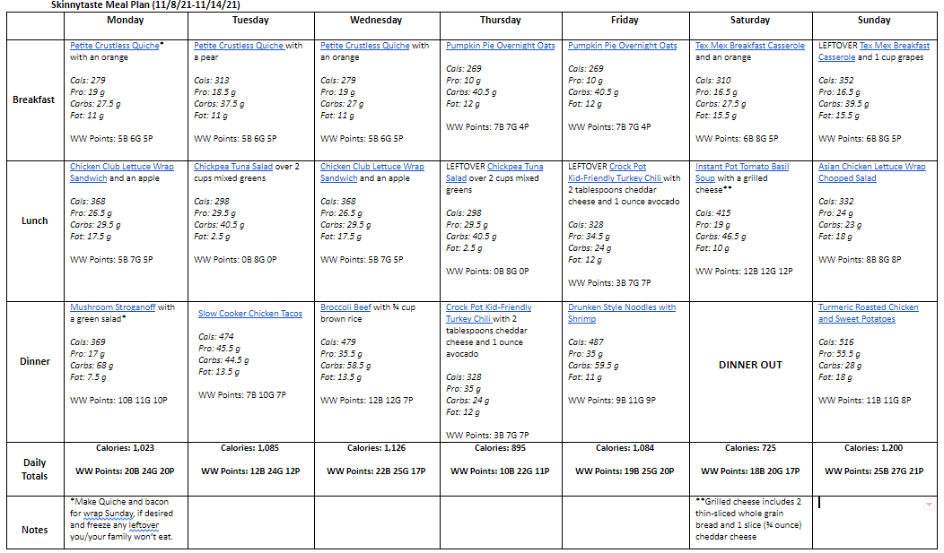 Breakfast and lunch Monday-Friday, are designed to serve 1 while dinners and all meals on Saturday and Sunday are designed to serve a family of 4. Some recipes make enough leftovers for two nights or lunch the next day. While we truly believe there is no one size fits all meal plan, we did our best to come up with something that appeals to a wide range of individuals. Everything is Weight Watchers friendly, I included the updated WW Blue SP for your convenience, feel free to swap out any recipes you wish or just use this for inspiration!
