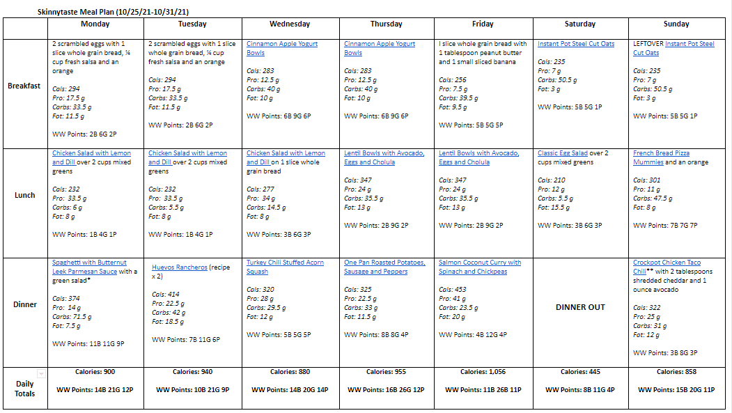 Breakfast and lunch Monday-Friday, are designed to serve 1 while dinners and all meals on Saturday and Sunday are designed to serve a family of 4. Some recipes make enough leftovers for two nights or lunch the next day. While we truly believe there is no one size fits all meal plan, we did our best to come up with something that appeals to a wide range of individuals. Everything is Weight Watchers friendly, I included the updated WW Blue SP for your convenience, feel free to swap out any recipes you wish or just use this for inspiration!