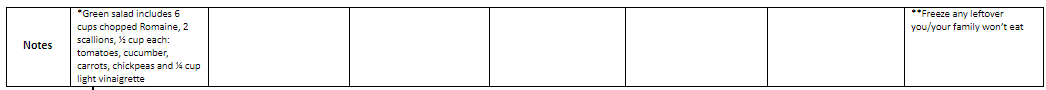*Green salad includes 6 cups chopped Romaine, 2 scallions, ½ cup each: tomatoes, cucumber, carrots, chickpeas