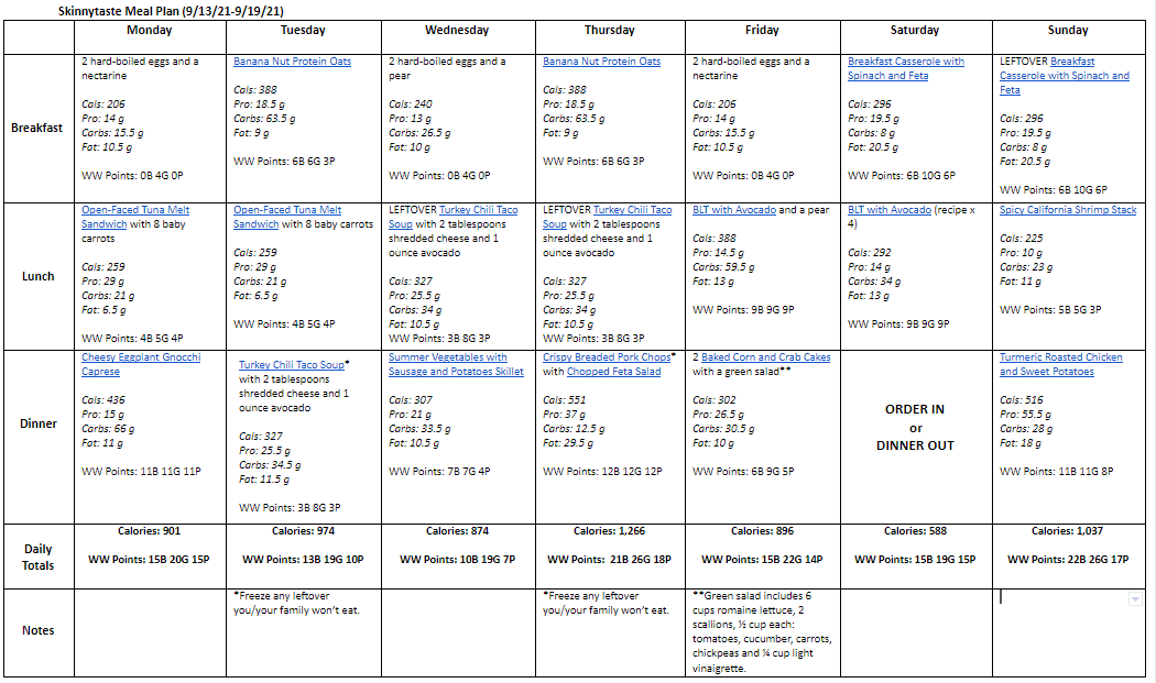 Breakfast and lunch Monday-Friday, are designed to serve 1 while dinners and all meals on Saturday and Sunday are designed to serve a family of 4. Some recipes make enough leftovers for two nights or lunch the next day. While we truly believe there is no one size fits all meal plan, we did our best to come up with something that appeals to a wide range of individuals. Everything is Weight Watchers friendly, I included the updated WW Blue SP for your convenience, feel free to swap out any recipes you wish or just use this for inspiration!