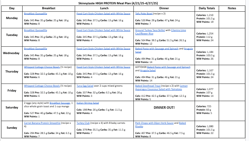 A free, 7-day high protein diet meal plan including breakfast, lunch and dinner ideas and a shopping list. All recipes include macros and Weight Watchers points.