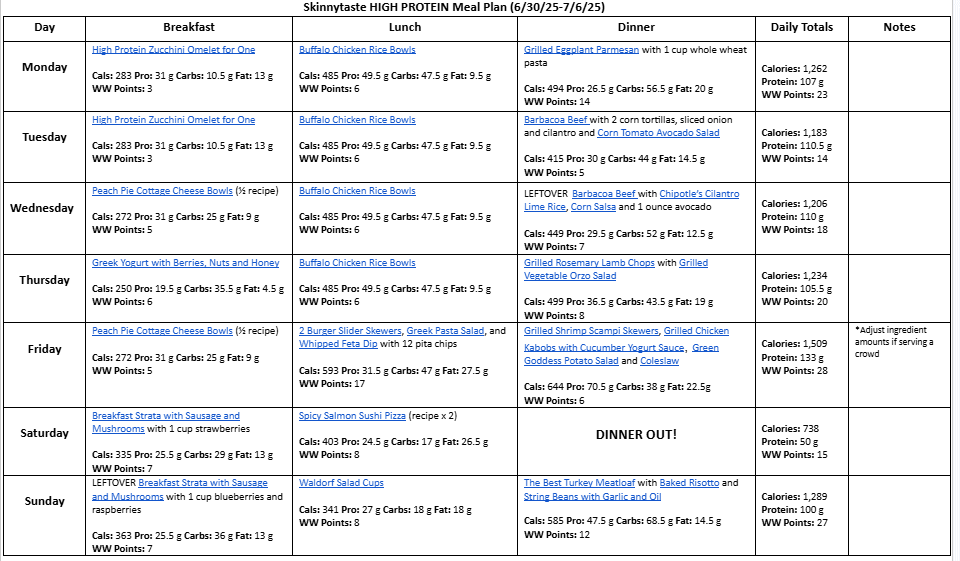 A free, 7-day high protein diet meal plan including breakfast, lunch and dinner ideas and a shopping list. All recipes include macros and Weight Watchers points.