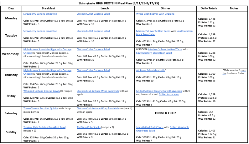 A free, 7-day high protein diet meal plan including breakfast, lunch and dinner ideas and a shopping list. All recipes include macros and Weight Watchers points.