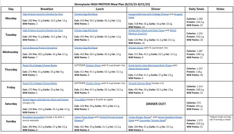 A free, 7-day high protein diet meal plan including breakfast, lunch and dinner ideas and a shopping list. All recipes include macros and Weight Watchers points.
