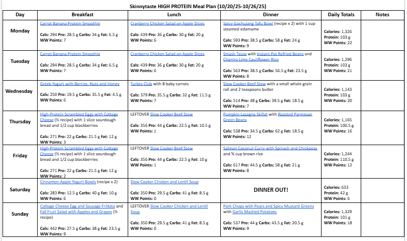 A free, 7-day high protein diet meal plan including breakfast, lunch and dinner ideas and a shopping list. All recipes include macros and Weight Watchers points.