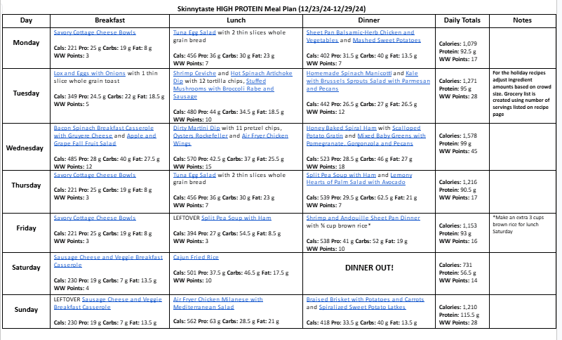A free, 7-day high protein diet meal plan including breakfast, lunch and dinner ideas and a shopping list. All recipes include macros and Weight Watchers points.