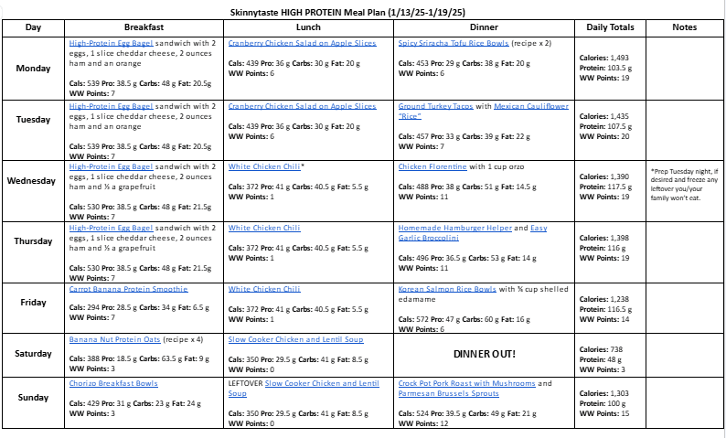 You may notice that this is the second week in a row for a high protein meal plan—well guess what!? All of the meal plans for January will be! There’s over 100 grams of protein for each day. I also know that the weather is crazy- and cold- for many this week. Check out my soups and stews for easy ways to stay warm. It’s also National Slow Cooker Month, check out all my slow cooker recipes here.