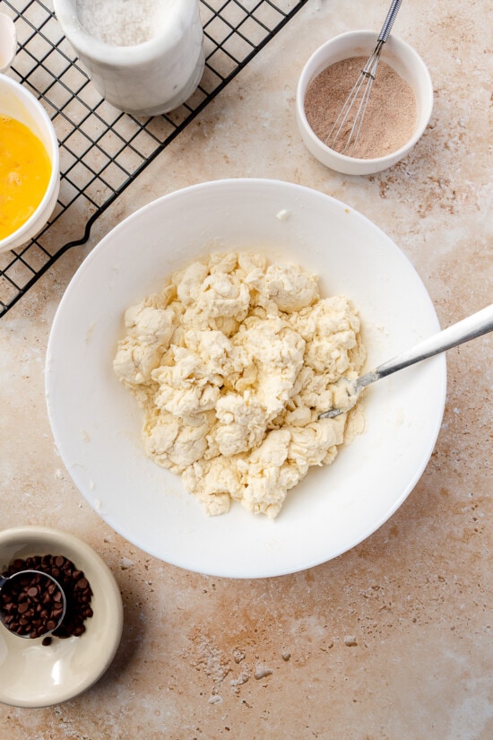 - Stuff the Bagels: Divide the dough into four equal balls. Roll each ball into ¾-inch ropes about seven inches long. Press the rope flat, brush it lightly with the beaten egg, and sprinkle with cinnamon sugar and mini chocolate chips. Press the chips lightly into the dough. Bring the outer sides of the smashed rope up and over to close it over the filling. Join the ends to form a bagel. Repeat with the remaining dough.