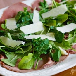 My favorite appetizer when I go to a local Italian spot near me is the beef carpaccio. Thin sliced raw beef, arugula and shaved Asiago. Here I used rare roast beef and made a lemon vinaigrette. My husband loved it! You can serve this as an appetizer for four or have it as a lunch for two. For a vegetarian option see Zucchini Carpaccio.