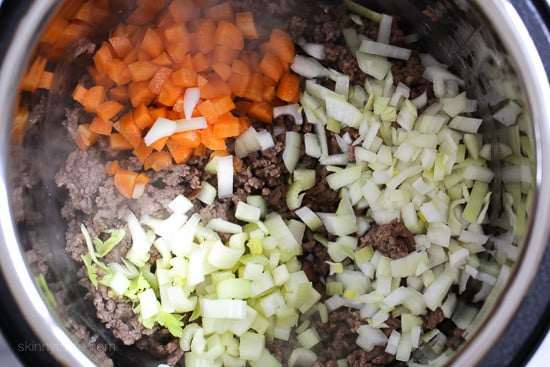 - Press the saute button, when it's very hot add the ground beef and salt and cook until browned breaking the meat up into small pieces as it cooks. When browned, add the onion, celery and carrots and saute 3 to 4 minutes.