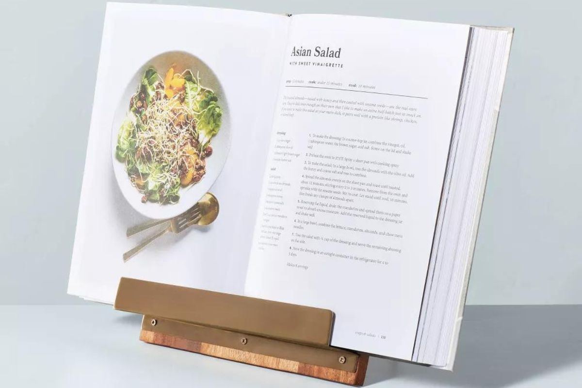 This pretty cookbook holder would be a useful cooking gift for anyone who cooks a lot—and is the perfect thing to display any of my cookbooks! The stylish design is made from real wood, and it has a spacious metal ledge that props up a cookbook and holds it open to the right page for less mess trying to hold the page down when your hands are full.