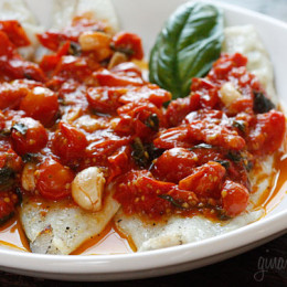 Broiled fish topped with a quick garden tomato sauce using summer grape tomatoes, fresh basil and garlic. I served this over orzo for a complete meal.