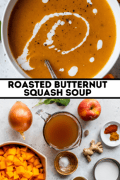 This Butternut Squash Soup has a creamy texture and is so good and easy to make. To make it extra flavorful, the butternut squash is roasted in the oven with the apples, onion, and sage to enhance the flavor, and then it’s blended with coconut milk and ginger. This butternut soup is perfect with a salad or sandwich for lunch or as a starter for dinner. More healthy butternut squash soup recipes to try are this Coconut Curry Butternut Squash Soup or this Slow Cooker Butternut Squash Soup.