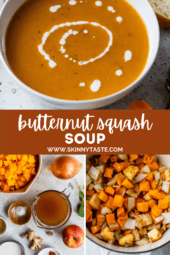 A cozy bowl of Butternut Squash Soup recipe sweetened with apples and seasoned with warming spices like ginger, cinnamon, and paprika. It’s made with coconut milk, so it’s also dairy-free and vegan.