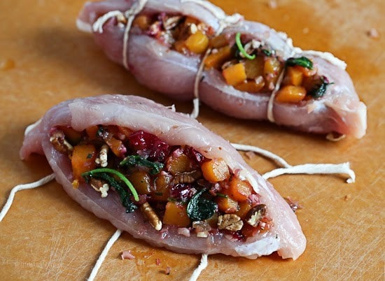- Stuff each turkey breast with about 3/4 cup of squash mixture. Cut cooking twine long enough to tie each breast with 3 to 4 pieces of twine. Cut off extra twine.