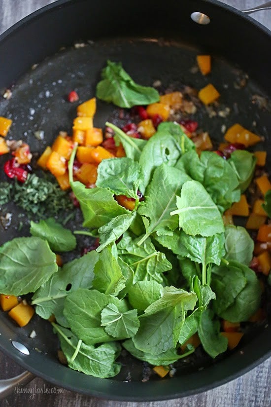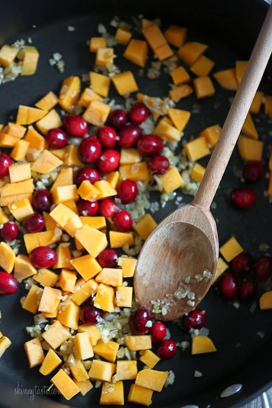 - Heat a large skillet over medium-high heat and add olive oil. Add shallots and garlic and sauté over medium-low heat for 4-5 minutes, or until golden. Add butternut squash, cranberries, maple syrup and 1 tablespoon water and cover; cook on low for 10 minutes.