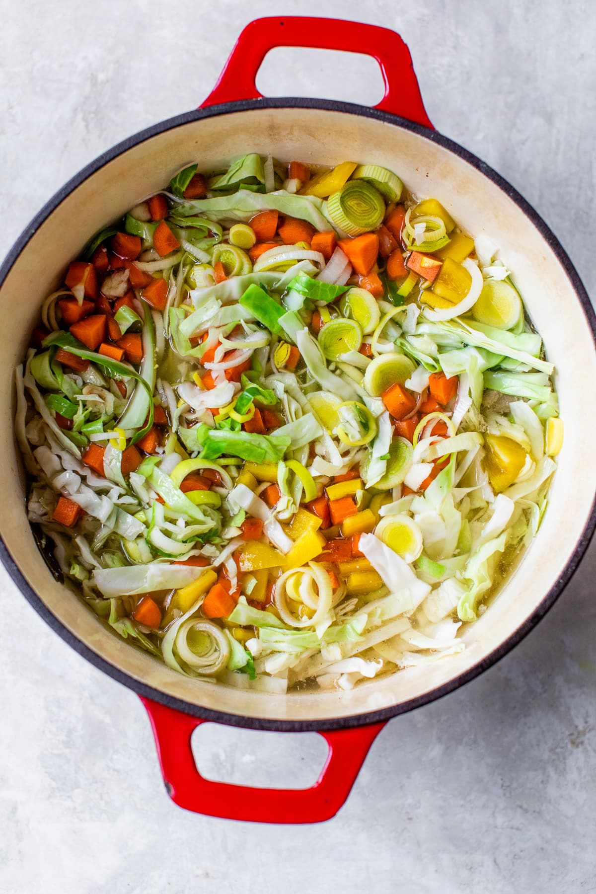 This hearty cabbage soup with chicken, pork and lots of vegetables is a simple one pot meal.
