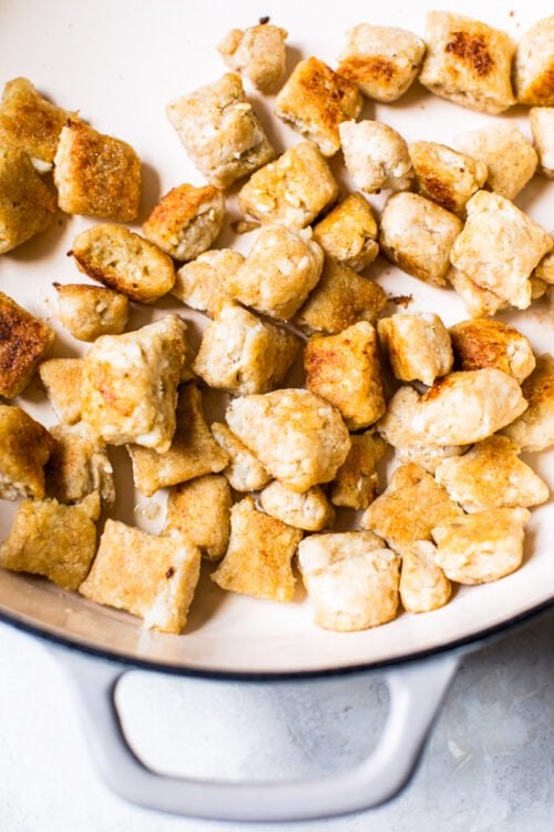 The trick to cooking cauliflower gnocchi for best results is to pan-fry them with a little olive oil spray (or cook them in the air fryer). Boiling them like traditional gnocchi wouldn’t be as good. Then, simply add them to your favorite sauce and enjoy.