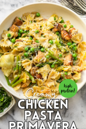 Primavera means “spring” in Italian, so I thought the name for this high-protein pasta dish was fitting since it’s made with spring asparagus, leeks, artichokes, and peas. The creamy sauce is made with cream cheese and parmesan cheese blended with a little milk, and each portion has a generous amount of veggies and chicken with 30 grams of protein per serving. It’s delicious, I hope you enjoy! For more primavera recipes, try this Risotto Primavera and Spaghetti Squash Primavera.